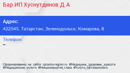 Бар, ИП Хуснутдинов Д.А. по адресу 422545, Татарстан, Зеленодольск, Комарова, 8 в дальнейшем Организация, размещена в следующих категориях: