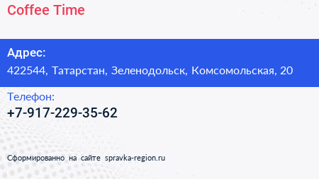 Coffee Time по адресу 422544, Татарстан, Зеленодольск, Комсомольская, 20 в дальнейшем Организация, размещена в следующих категориях: