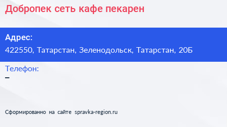 Добропек, сеть кафе-пекарен по адресу 422550, Татарстан, Зеленодольск, Татарстан, 20Б в дальнейшем Организация, размещена в следующих категориях: