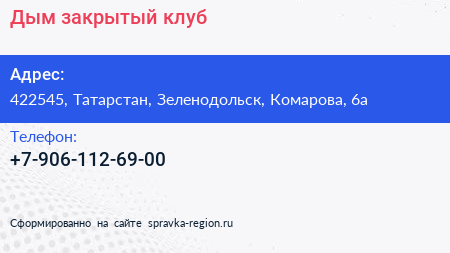 Дым, закрытый клуб по адресу 422545, Татарстан, Зеленодольск, Комарова, 6а в дальнейшем Организация, размещена в следующих категориях: