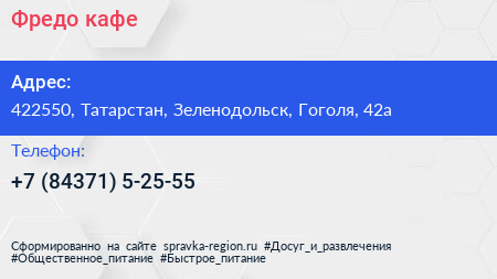 Фредо, кафе по адресу 422550, Татарстан, Зеленодольск, Гоголя, 42а в дальнейшем Организация, размещена в следующих категориях: