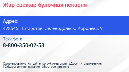 Жар свежар, булочная-пекарня по адресу 422545, Татарстан, Зеленодольск, Королёва, 9 в дальнейшем Организация, размещена в следующих категориях: