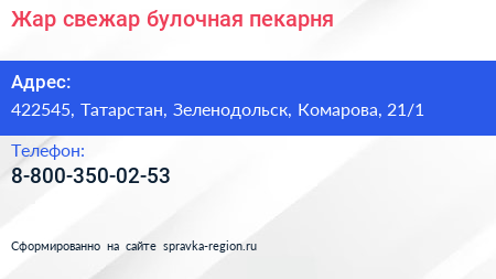 Жар свежар, булочная-пекарня по адресу 422545, Татарстан, Зеленодольск, Комарова, 21/1 в дальнейшем Организация, размещена в следующих категориях: