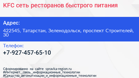 KFC, сеть ресторанов быстрого питания по адресу 422545, Татарстан, Зеленодольск, проспект Строителей, 30 в дальнейшем Организация, размещена в следующих категориях: