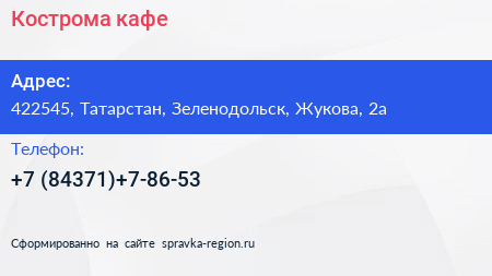 Кострома, кафе по адресу 422545, Татарстан, Зеленодольск, Жукова, 2а в дальнейшем Организация, размещена в следующих категориях: