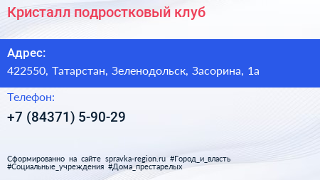 Кристалл, подростковый клуб по адресу 422550, Татарстан, Зеленодольск, Засорина, 1а в дальнейшем Организация, размещена в следующих категориях: