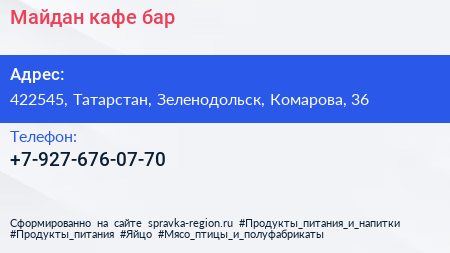 Майдан, кафе-бар по адресу 422545, Татарстан, Зеленодольск, Комарова, 36 в дальнейшем Организация, размещена в следующих категориях: