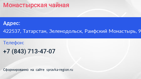 Монастырская чайная по адресу 422537, Татарстан, Зеленодольск, Раифский Монастырь, 9 в дальнейшем Организация, размещена в следующих категориях: