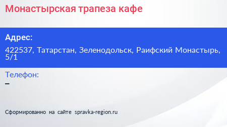 Монастырская трапеза, кафе по адресу 422537, Татарстан, Зеленодольск, Раифский Монастырь, 5/1 в дальнейшем Организация, размещена в следующих категориях: