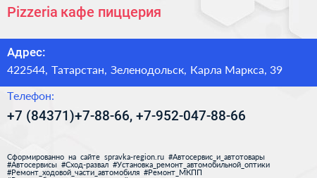Pizzeria, кафе-пиццерия по адресу 422544, Татарстан, Зеленодольск, Карла Маркса, 39 в дальнейшем Организация, размещена в следующих категориях: