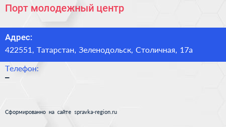 Порт, молодежный центр по адресу 422551, Татарстан, Зеленодольск, Столичная, 17а в дальнейшем Организация, размещена в следующих категориях: