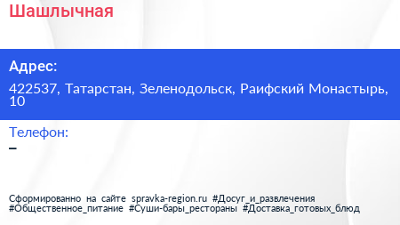 Шашлычная по адресу 422537, Татарстан, Зеленодольск, Раифский Монастырь, 10 в дальнейшем Организация, размещена в следующих категориях: