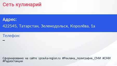 Сеть кулинарий по адресу 422545, Татарстан, Зеленодольск, Королёва, 1а в дальнейшем Организация, размещена в следующих категориях: