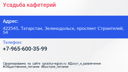Усадьба, кафетерий по адресу 422545, Татарстан, Зеленодольск, проспект Строителей, 54 в дальнейшем Организация, размещена в следующих категориях: