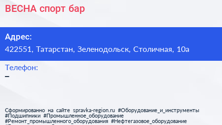 ВЕСНА, спорт бар по адресу 422551, Татарстан, Зеленодольск, Столичная, 10а в дальнейшем Организация, размещена в следующих категориях:
