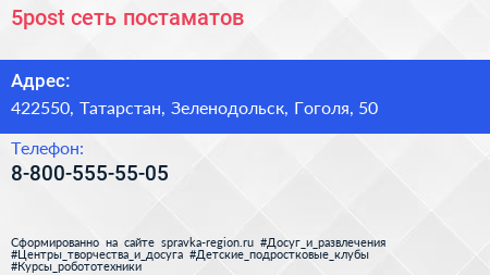 5post, сеть постаматов по адресу 422550, Татарстан, Зеленодольск, Гоголя, 50 в дальнейшем Организация, размещена в следующих категориях: