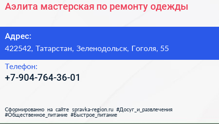 Аэлита, мастерская по ремонту одежды по адресу 422542, Татарстан, Зеленодольск, Гоголя, 55 в дальнейшем Организация, размещена в следующих категориях: