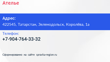 Ателье по адресу 422545, Татарстан, Зеленодольск, Королёва, 1а в дальнейшем Организация, размещена в следующих категориях: