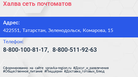 Халва, сеть почтоматов по адресу 422551, Татарстан, Зеленодольск, Комарова, 15 в дальнейшем Организация, размещена в следующих категориях:
