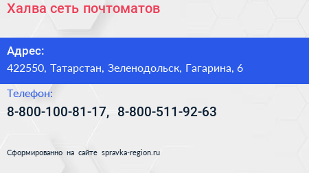 Халва, сеть почтоматов по адресу 422550, Татарстан, Зеленодольск, Гагарина, 6 в дальнейшем Организация, размещена в следующих категориях: