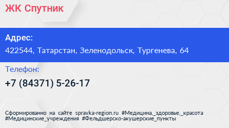 ЖК Спутник по адресу 422544, Татарстан, Зеленодольск, Тургенева, 64 в дальнейшем Организация, размещена в следующих категориях: