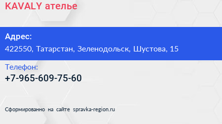 KAVALY, ателье по адресу 422550, Татарстан, Зеленодольск, Шустова, 15 в дальнейшем Организация, размещена в следующих категориях: