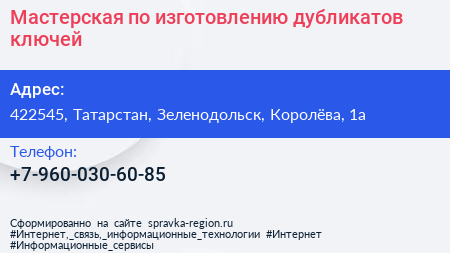 Мастерская по изготовлению дубликатов ключей по адресу 422545, Татарстан, Зеленодольск, Королёва, 1а в дальнейшем Организация, размещена в следующих категориях: