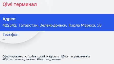 Qiwi, терминал по адресу 422542, Татарстан, Зеленодольск, Карла Маркса, 58 в дальнейшем Организация, размещена в следующих категориях:
