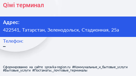 Qiwi, терминал по адресу 422541, Татарстан, Зеленодольск, Стадионная, 25а в дальнейшем Организация, размещена в следующих категориях: