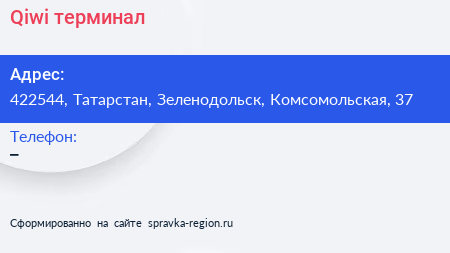 Qiwi, терминал по адресу 422544, Татарстан, Зеленодольск, Комсомольская, 37 в дальнейшем Организация, размещена в следующих категориях: