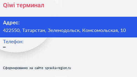 Qiwi, терминал по адресу 422550, Татарстан, Зеленодольск, Комсомольская, 10 в дальнейшем Организация, размещена в следующих категориях: