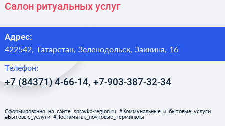 Салон ритуальных услуг по адресу 422542, Татарстан, Зеленодольск, Заикина, 16 в дальнейшем Организация, размещена в следующих категориях: