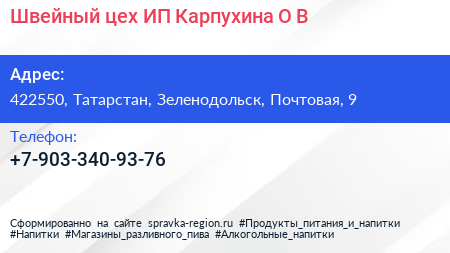 Швейный цех, ИП Карпухина О.В. по адресу 422550, Татарстан, Зеленодольск, Почтовая, 9 в дальнейшем Организация, размещена в следующих категориях: