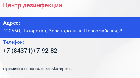 Центр дезинфекции по адресу 422550, Татарстан, Зеленодольск, Первомайская, 8 в дальнейшем Организация, размещена в следующих категориях: