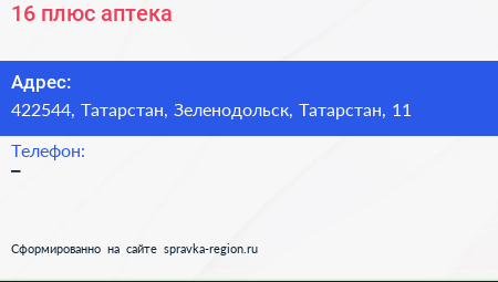 16 плюс, аптека по адресу 422544, Татарстан, Зеленодольск, Татарстан, 11 в дальнейшем Организация, размещена в следующих категориях:
