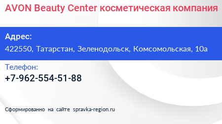 AVON Beauty Center, косметическая компания по адресу 422550, Татарстан, Зеленодольск, Комсомольская, 10а в дальнейшем Организация, размещена в следующих категориях: