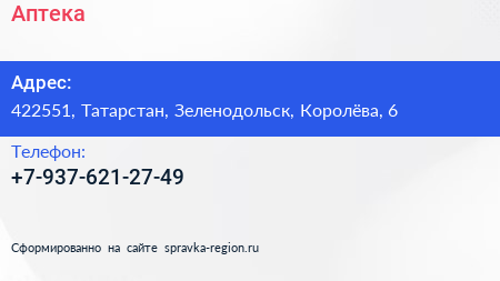 Аптека по адресу 422551, Татарстан, Зеленодольск, Королёва, 6 в дальнейшем Организация, размещена в следующих категориях: