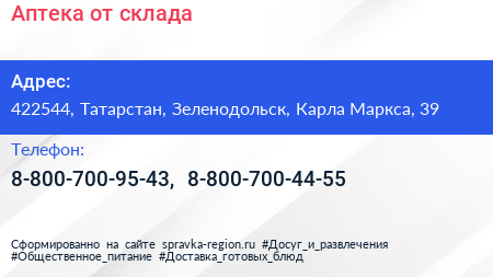 Аптека от склада по адресу 422544, Татарстан, Зеленодольск, Карла Маркса, 39 в дальнейшем Организация, размещена в следующих категориях: