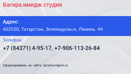 Багира, имидж-студия по адресу 422550, Татарстан, Зеленодольск, Ленина, 44 в дальнейшем Организация, размещена в следующих категориях: