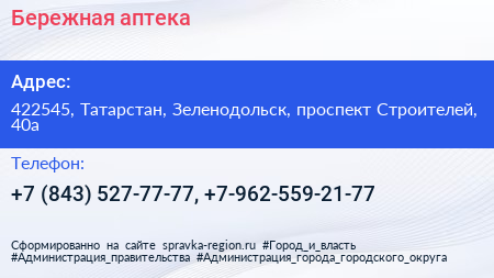 Бережная аптека по адресу 422545, Татарстан, Зеленодольск, проспект Строителей, 40а в дальнейшем Организация, размещена в следующих категориях:
