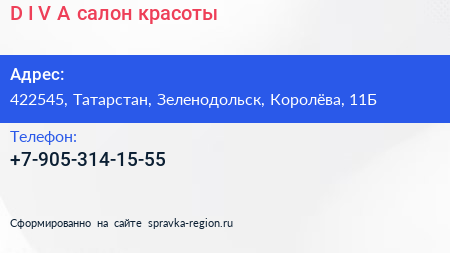 D.I.V.A, салон красоты по адресу 422545, Татарстан, Зеленодольск, Королёва, 11Б в дальнейшем Организация, размещена в следующих категориях: