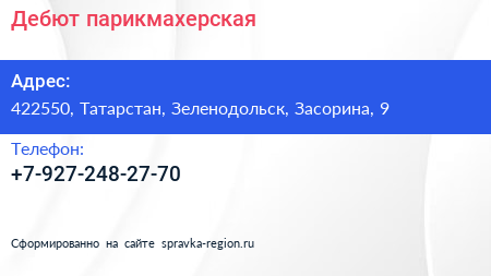 Дебют, парикмахерская по адресу 422550, Татарстан, Зеленодольск, Засорина, 9 в дальнейшем Организация, размещена в следующих категориях: