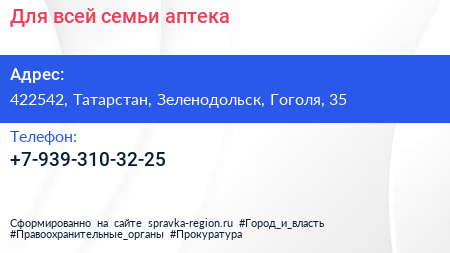 Для всей семьи, аптека по адресу 422542, Татарстан, Зеленодольск, Гоголя, 35 в дальнейшем Организация, размещена в следующих категориях: