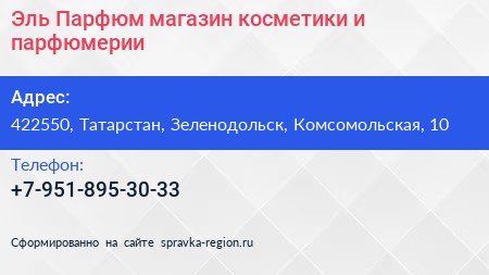 Эль Парфюм, магазин косметики и парфюмерии по адресу 422550, Татарстан, Зеленодольск, Комсомольская, 10 в дальнейшем Организация, размещена в следующих категориях: