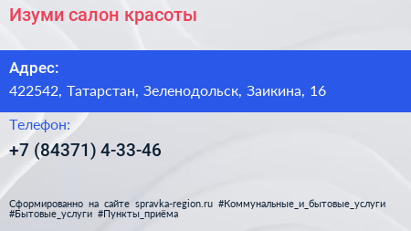 Изуми, салон красоты по адресу 422542, Татарстан, Зеленодольск, Заикина, 16 в дальнейшем Организация, размещена в следующих категориях: