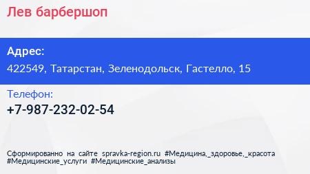 Лев, барбершоп по адресу 422549, Татарстан, Зеленодольск, Гастелло, 15 в дальнейшем Организация, размещена в следующих категориях: