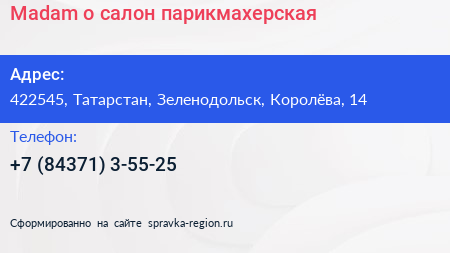 Madam`o, салон-парикмахерская по адресу 422545, Татарстан, Зеленодольск, Королёва, 14 в дальнейшем Организация, размещена в следующих категориях: