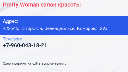 Pretty Woman, салон красоты по адресу 422545, Татарстан, Зеленодольск, Комарова, 29а в дальнейшем Организация, размещена в следующих категориях: