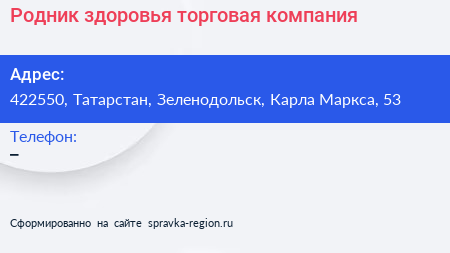 Родник здоровья, торговая компания по адресу 422550, Татарстан, Зеленодольск, Карла Маркса, 53 в дальнейшем Организация, размещена в следующих категориях: