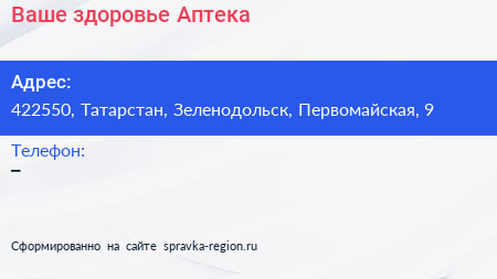Ваше здоровье, Аптека по адресу 422550, Татарстан, Зеленодольск, Первомайская, 9 в дальнейшем Организация, размещена в следующих категориях: